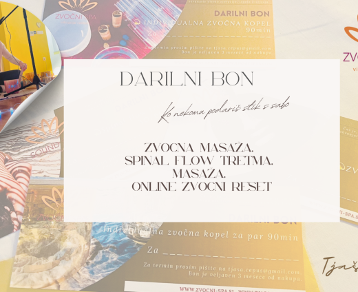 Podari nežen trenutek skrbi zase ali svojim bližnjim. Naši darilni boni ponujajo različne oblike sprostitve, regeneracije in zvočne podpore, ki pomagajo telesu, umu in energiji, da se ponovno uskladijo.