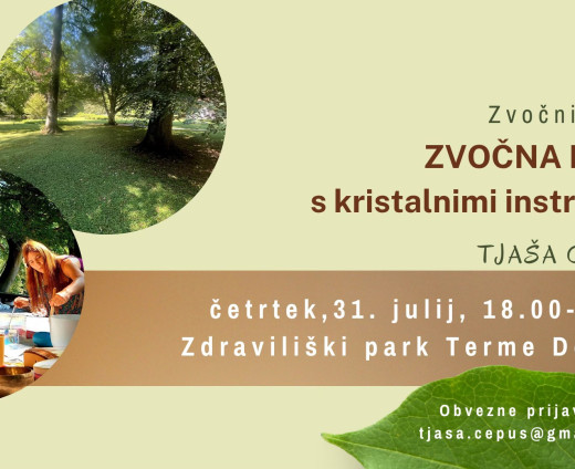 Pridružite se nam na edinstveni zvočni kopeli s kristalnimi instrumenti, ki vas bo popeljala v globoko sprostitev telesa in uma. V čudovitem ambientu zdraviliškega parka Term Dobrna bomo skozi harmonične vibracije vstopili v stanje tišine, miru in notranjega ravnovesja.